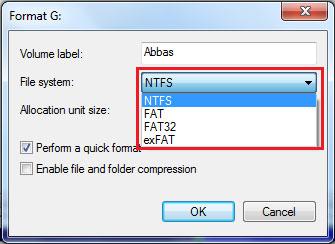 پنجره جدیدی باز می شود که حاوی تنظیمات فرمت مورد نظرتان می باشد. در قسمت File System فرمت NTFS را انتخاب کنید و گزینه Ok را انتخاب کنید تا عملیات تغییر فرمت انجام شود.