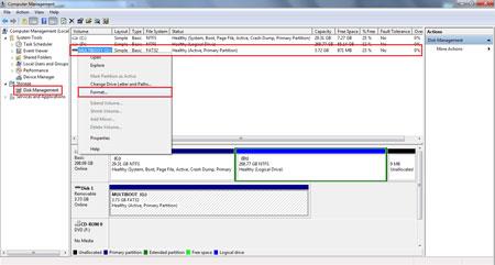 در پنجره باز شده به قسمت Disk Management بروید و در کادر روبروی آن به دنبال فلش خود بگردید، روی آن کلیک راست کنید و گزینه Format را انتخاب کنید.