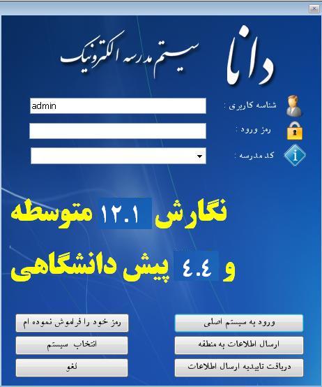 ضمن آرزوی سلامتی ، با توجه به تماس مکرر همکاران به اطلاع می رساند که در نگارش جدید دانا {نگارش 12 } (متوسطه دوره دوم ( بدلایل امنیتی جهت ارسال اطلاعات به سیستم متمرکز تحت ویندوز منطقه ، نیاز به کاربری و رمز ویژه می باشد که این کاربری و رمز ،  همان  کاربری و رمز اختصاص داده شده به پایگاه اطلاعات یکپارچه  دانش  آموزی( http://school.medu.ir )